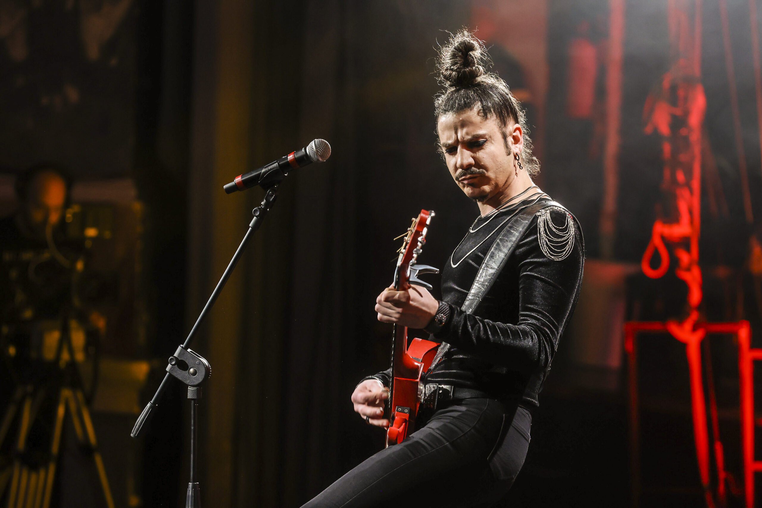 La terza proposta della serata è Chiara Osso, classe 2004, che con L’otto riesce a trasportarci fra le vie e le bellezze di Roma e con Emma affronta il tema spinoso della prostituzione. La giovanissima artista è un’osservatrice acuta della realtà che ama raccontare storie attraverso la musica. Il contrasto tra bianco e nero del suo look riflette la contrapposizione tra la componente razionale e quella irrazionale della sua personalità.