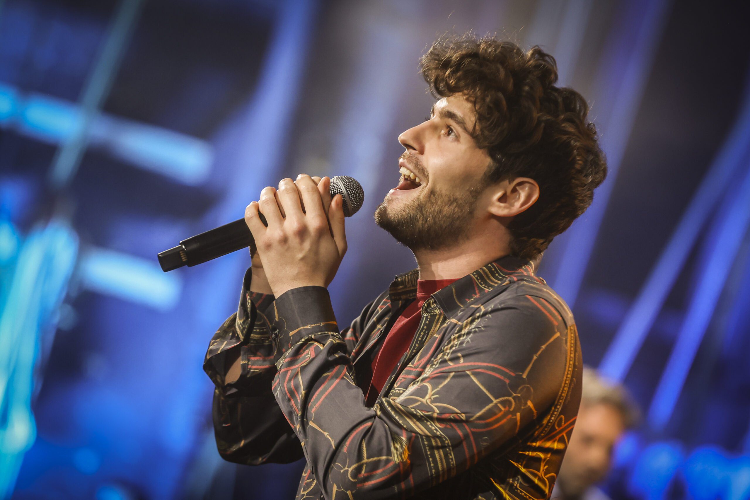 Terzo a proporre la sua produzione è Caruccio. Baby blue – spiega l’autore prima della sua performance – è una canzone che racconta di due anime che, in un linguaggio di diffidente amore, saranno capaci di star vicine solo graffiandosi. Sarajevo, invece, è un brano dal «retrogusto da telenovela romantica da seconda serata».
